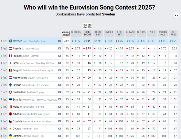 Цікаво, що в кінці квітня букмекери прогнозували Україні 11 місце, а станом на зараз гурт Ziferblat займає 14-ту сходинку з всього 1%.