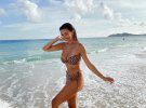 Спокуслива американка позує на тлі океану в леопардовому роздільному купальнику, хизуючись апетитними формами.