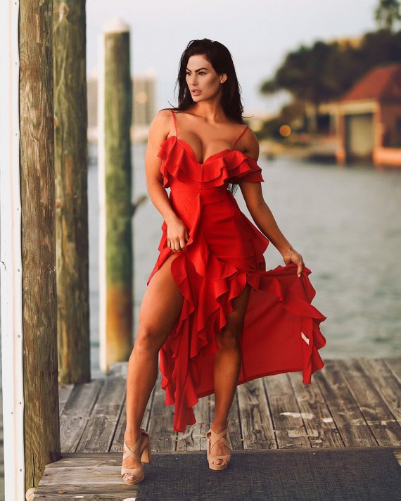 Ефектна брюнетка постала в розкішній червоній сукні з глибоким декольте, демонструючи пишні груди.
