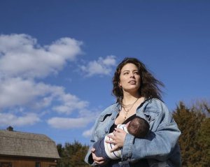 Модель опублікувала фото з сином на руках біля дерев'яної огорожі на тлі фермерської господарської споруди.