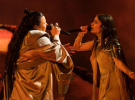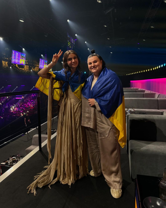Номер Teresa & Maria ставила режисерка Таню Муіньо. Jerry Heil постала в бежевій сукні з бахромою і металевим рукавом. alyona alyona була в бежевих штанах, металевій кольчузі і тренчі у тон.