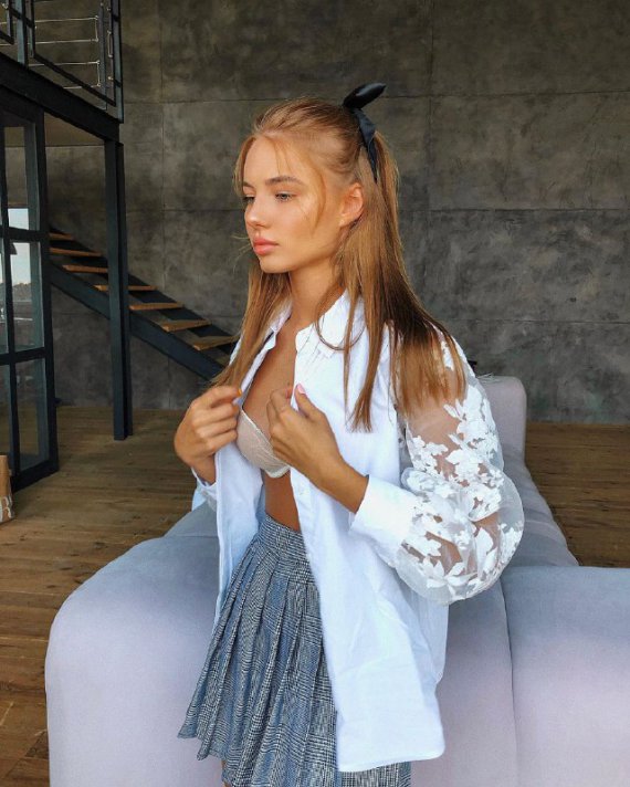 Дівчина позувала у білій блузці з мереживом, короткій спідниці та бежевому бюстгальтері. Волосся Ліза зав'язала чорним бантом. На обличчі дівчини був денний макіяж.