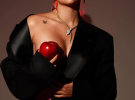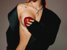 Перед камерою постала повністю оголеною. З одягу на ній був лише подовжений жакет чорного кольору. Груди артистка прикрила червоним яблуком.