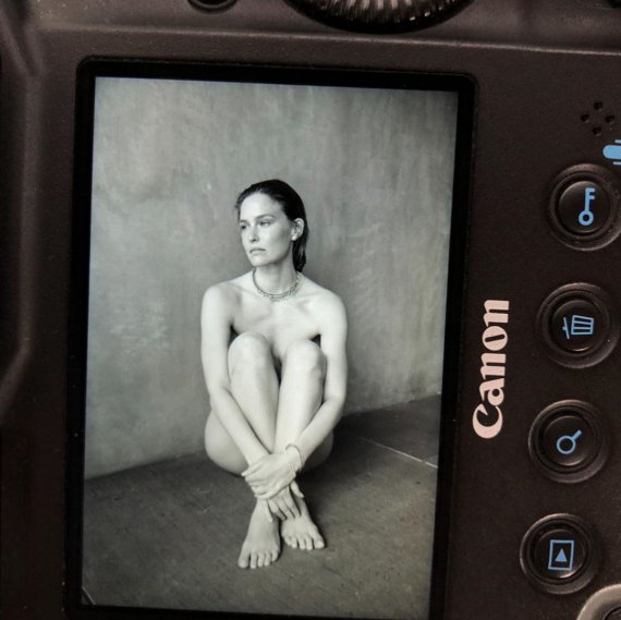 Манекенниця у відвертій фотосесії позує оголеною, сидячи на підлозі. На ній лише браслет і намисто.