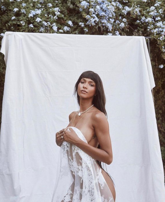 На серії знімків сексуальна модель позує лише в білих трусиках, прикриваючи оголені груди мереживною напівпрозорою тканиною. Також зірка одягнула намисто.