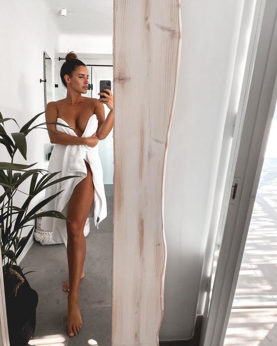 Спортсменка на останній фотографії позує оголеною, прикриваючись рушником. Волосся зібрала в пучок.