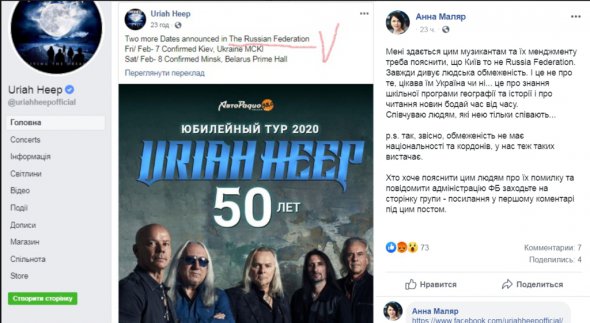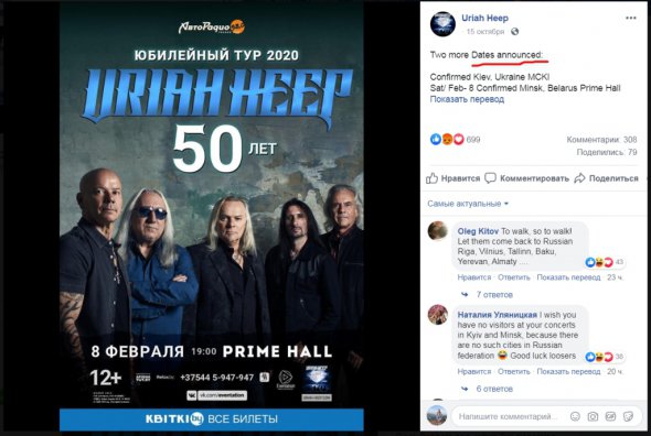 Британський рок-гурт Uriah Heep в анонсі концертів назвав Україну та Білорусь частиною Російської Федерації.
