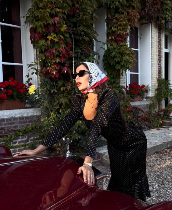 "Міс Україна Всесвіт 2021" Анна Неплях похизувалась стрункою фігурою у сукні в горошок і хустинці. Образ доповнила великою кількістю золотих прикрас і сонцезахисними окулярами.