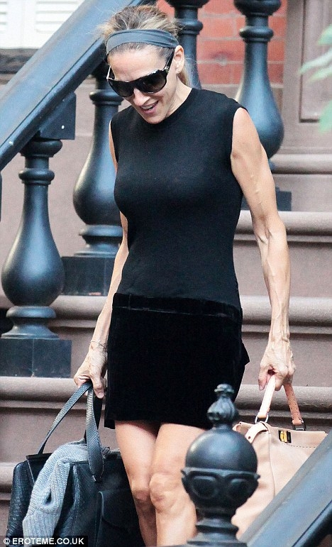 Актриса, одягнена в коротеньку чорну сукню, продемонструвала свої худі, суцільно вкриті венами руки і ноги, несучи сумки до машини. Причому 46-річна Сара явно пишається своєю занадто стрункою фігурою, котру підтримує за допомогою вправ і дієт.