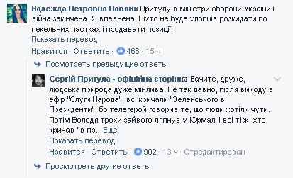 "Надія, не слід такого писати...Ви і мене ставите в незручне становище, і роботу офіцерів з МО нівелюєте. А там дуже багато гідних людей. Вибачте за зауваження, просто це дуже оманливий тезу: "чувака в міністри - він припинить війну". Таке буває тільки в казках", - написав Приула.