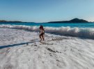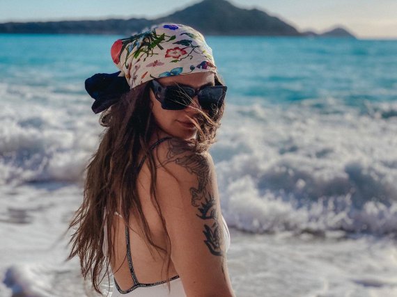 Зірка позувала в білосніжному монокіні. Пляжний образ доповнила атласною хусткою з принтом і протисонцевими окулярами. Фотосесію влаштувала на тлі бурхливих хвиль.