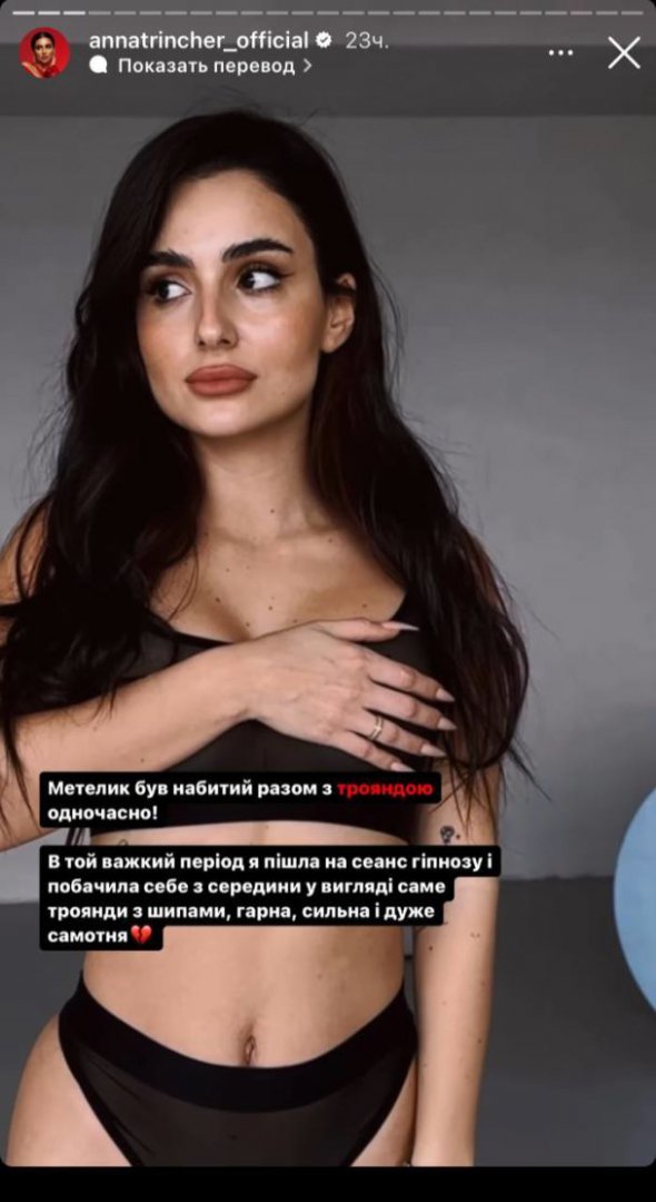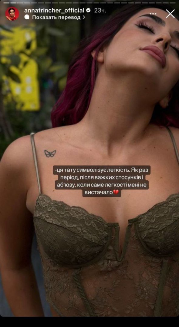 "Метелик був набитий разом із трояндою. У той тяжкий період я пішла на сеанс гіпнозу і побачила себе з середини у вигляді саме троянди з шипами: гарна, сильна і дуже самотня", – підсумувала Трінчер.