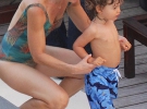 Хлопчик поки з побоюванням, але все ж занурюється у воду, міцно тримаючись за руки няні.