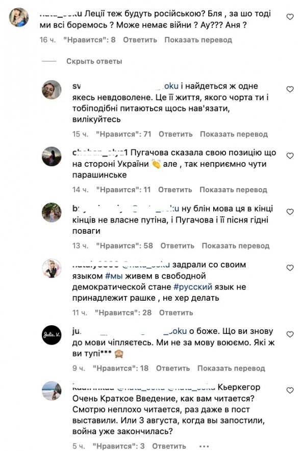 "Це її життя, якого чорта ти і тобі подібні намагаються щось нав'язати? Вилікуйтесь", "Пугачова сказала, що на боці України", "Мова ця, зрештою, не належить Путіну, і Пугачова, і її пісня гідні поваги", "Російська мова не належить Росії", – писали в коментарях.