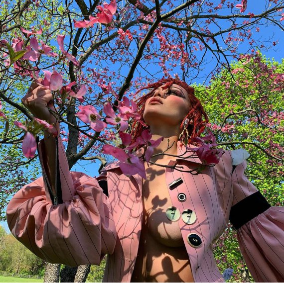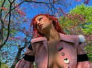Хадід знялася топлес з червоним волоссям та неординарний макіяжем. Найгарніша жінка світу позувала посеред квітучих дерев в світло-рожевому вбранні з осінньої колекції 2017 року Dilara Findikoglu.