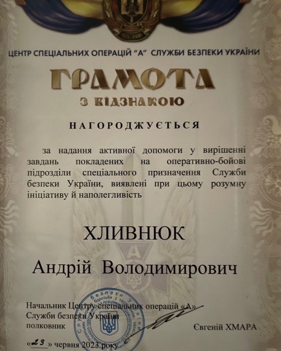 Лідер гурту "Бумбокс" Андрій Хливнюк, який захищає Україну на фронті, показав відзнаку від СБУ.