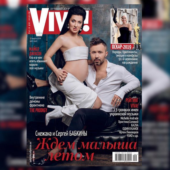 На знімку, зробленому для журналу Viva, співак позував у білій сорочці та штанях. А от Сніжана Бабкіна постала перед камерою у білому топі та спідниці, оголивши свій вагітний животик.