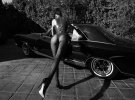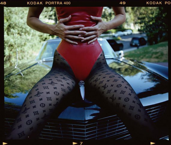 Для нової фотозйомки Кендалл одягла сексуальне червоне латексне боді, темні колготи з орнаментом Louis Vuitton і чорні туфлі на підборах. Зірка позувала біля розкішного раритетного автомобіля, демонструючи струнку фігуру й довгі ноги.