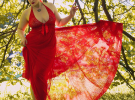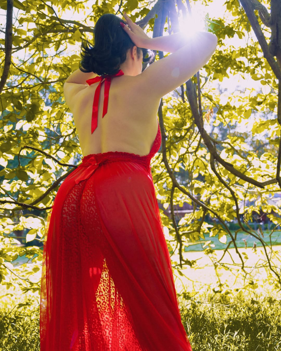 Перед камерою постала в червоному пеньюарі з мереживом і глибоким декольте.