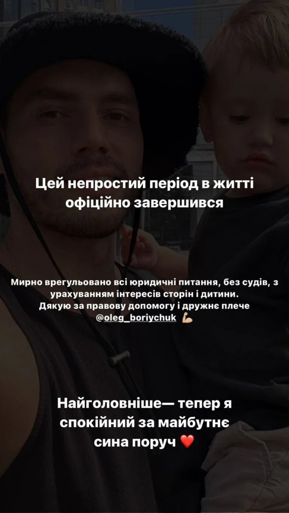 "Цей непростий період в житті офіційно завершився. Мирно врегульовано всі юридичні питання, без судів, з урахуванням інтересів сторін і дитини. Найголовніше – тепер я спокійний за майбутнє сина поруч", – зазначив.