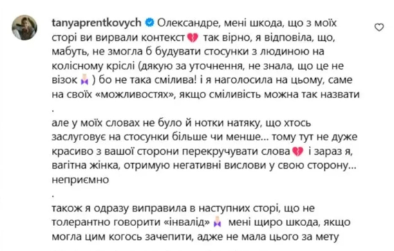 "Але у моїх словах не було й нотки натяку, що хтось заслуговує на стосунки більше чи менше. Тому тут не дуже красиво з вашого боку перекручувати слова. І зараз я, вагітна жінка, отримую негативні вислови у свій бік. Неприємно. Також я одразу виправила в наступних сторіс, що не толерантно говорити "інвалід". Мені щиро шкода, якщо могла цим когось зачепити, адже не мала цього за мету", - написала блогерка.