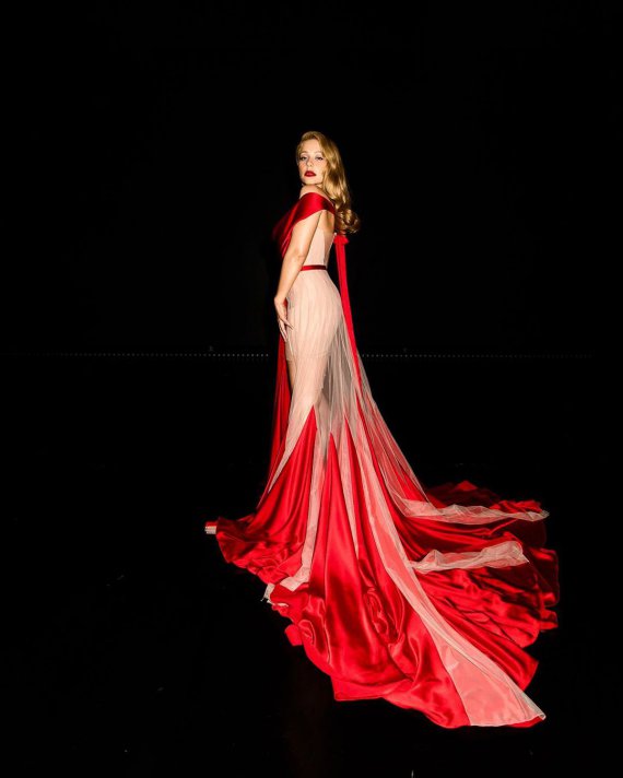 На серії знімків, опублікованих в Instagram, зірка позує в червоно-нюдовій сукні, хизуючись пишним бюстом і стрункими ногами. Кароль доповнила образ червоною помадою та коштовностями.