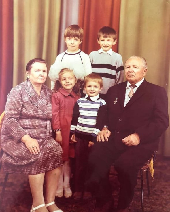 На фото маленька Тіна стоїть поруч зі старшим братом Стасом. А також своїми бабусею та дідусем. На дівчинці — червоне плаття по коліна зі строгим коміром. Довге світле волосся зав'язано в прикрашені пишними білими бантами два хвостики, що стримлять по боках.