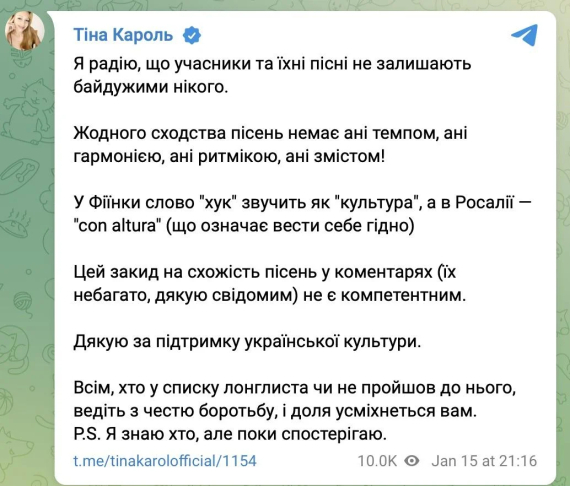 "Я радію, що учасники та їхні пісні не залишають байдужими нікого. Жодної схожості пісень немає ані темпом, ані гармонією, ані ритмікою, ані змістом. У FIЇNKA слово хук звучить як "культура", а в Rosalía - con altura (що означає "поводитися гідно"). Цей закид на схожість пісень у коментарях (їх небагато, дякую свідомим) не є компетентним", - зазначила продюсерка.