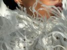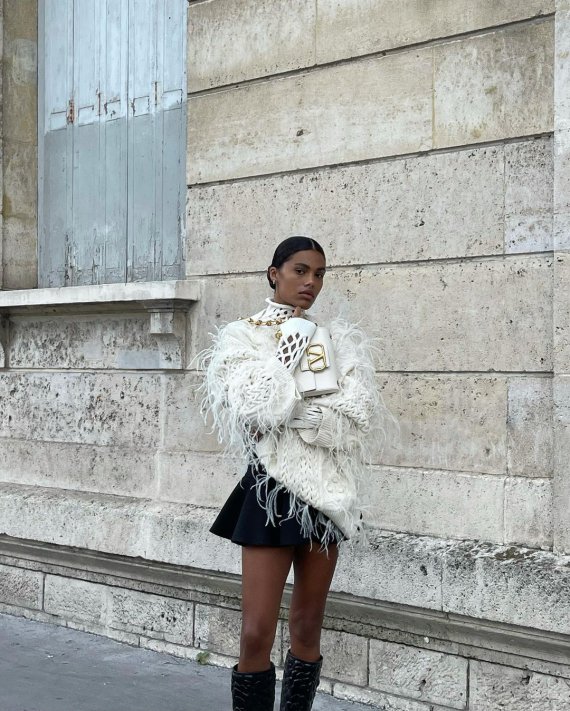 На світлині Тіна позує в ажурному білому светрі грубої в'язки з підкреслено довгими рукавами і високою горловиною від Valentino. Ця річ поєднала в собі модні акценти сезону, починаючи від кольору і закінчуючи декором у вигляді пір'я.
