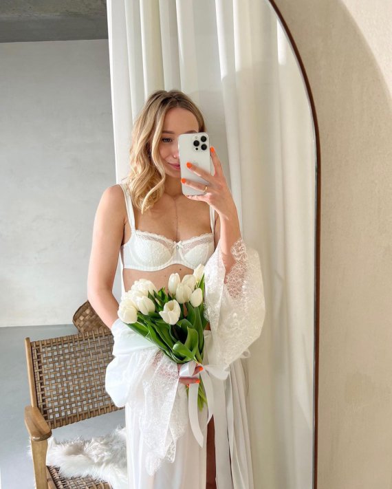 На світлинах молода матір позує білій мереживній білизні та халатику. Підкреслила ніжний образ нюдовим макіяжем та легкими, повітряними локонами. Довершеності аутфіту додали витончені прикраси та квіти. Для зйомки інфлюенсерка обрала білі тюльпани.