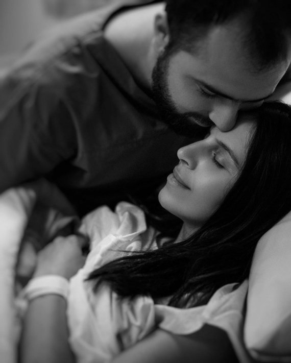 Зірка поділилася у Instagram чорно-білими знімками, на яких вона годує немовля, а над нею схилися чоловік, цілуючи кохану у скроню.