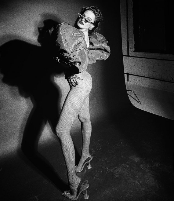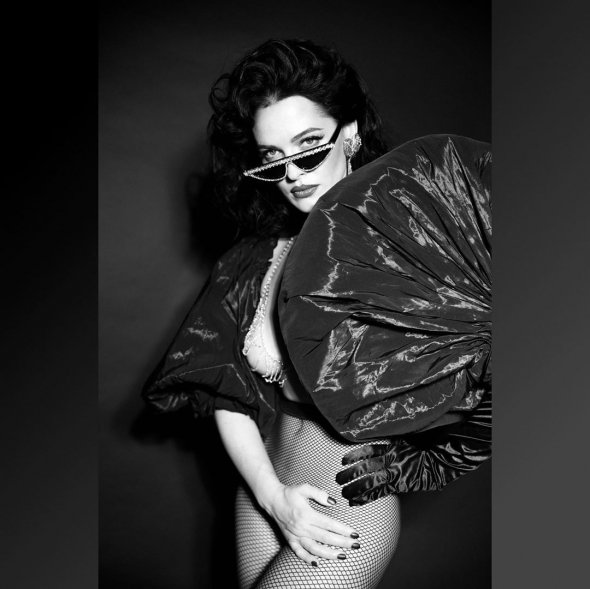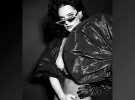 На знімках Даша позує у самих колготках в сіточку з високою посадкою. Груди ледь прикриває бюстгальтер у вигляді намиста. Незвичний образ доповнює накидка з рукавів-ліхтариків.