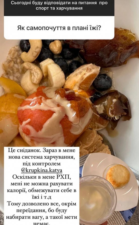У своєму Instagram зазначила, що через розлади харчової поведінки вона не підраховує калорії, а дозволяє собі все, окрім переїдання.