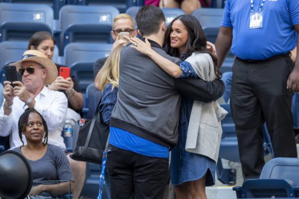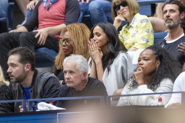 Меган з'явилася на зірковій трибуні, де вона сиділа між сестрою Вільямс Ішей Прайс і її тренером Патріком Муратолгу. Поблизу герцогині також зайняла місце редакторка Vogue Анна Вінтур. Жінка зустрілася з чоловіком подруги Алексісом Оганяном, з яким обійнялася при зустрічі.