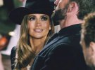 Лопес одягла чорну сукню в смужку з глибоким декольте і шпильки, а в якості аксесуару обрала капелюх і клатч. А ось Бен не зрадив класичному чорному костюму з краваткою.