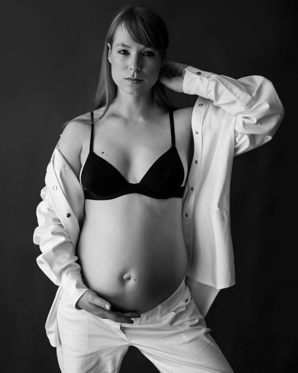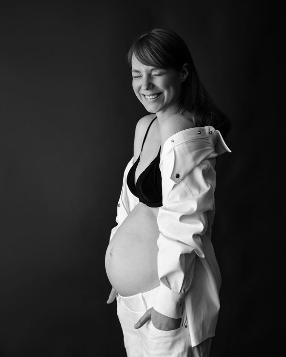 Тарабарова до радісного допису додала 2 чорно-білі світлини. На них зірка позує, відкривши оголений живіт при надії. На жінці чорний бюстгальтер, білі брюки, а на плечі накинуто бавовняну білу сорочку. Друге фото - зроблене в профіль. На ньому знаменитість радісно сміється.