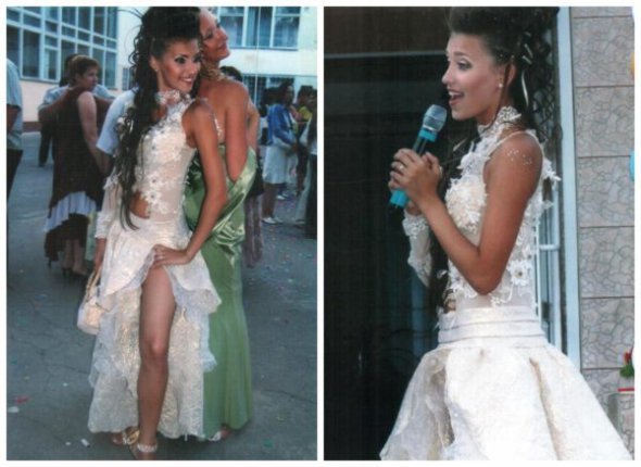 Телеведуча Регіна Тодоренко для випускного вечора одягнула довгу мереживну сукню з вирізами на талії. Верх вбрання оздоблений квітами й камінням. Яскравий образ Регіна доповнила об'ємною зачіскою. Як зазначила сама Тодоренко, в той вечір вона "перетворилася з гидкого каченяти на прекрасного лебедя".