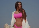 На фото зірка позує в рожевому купальнику й білій сорочці.