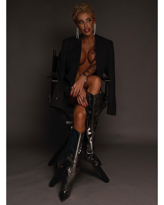 Ведуча позувала, сидячи на стільці і накинувши чорний піджак на голе тіло. Екстравагантний образ доповнили масивні сережки і лаковані ботфорти.