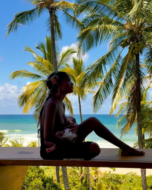 Вони позували на тлі пальм та Атлантичного океану. Жінка годувала хлопчика грудьми та насолоджувалась краєвидами.