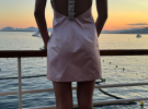 Для офіційного виходу Венсан одягнув темно-сірий костюм і рожеву сорочку. Його кохана постала перед камерами в рожевій мінісукні та чорних босоніжках на високій платформі.