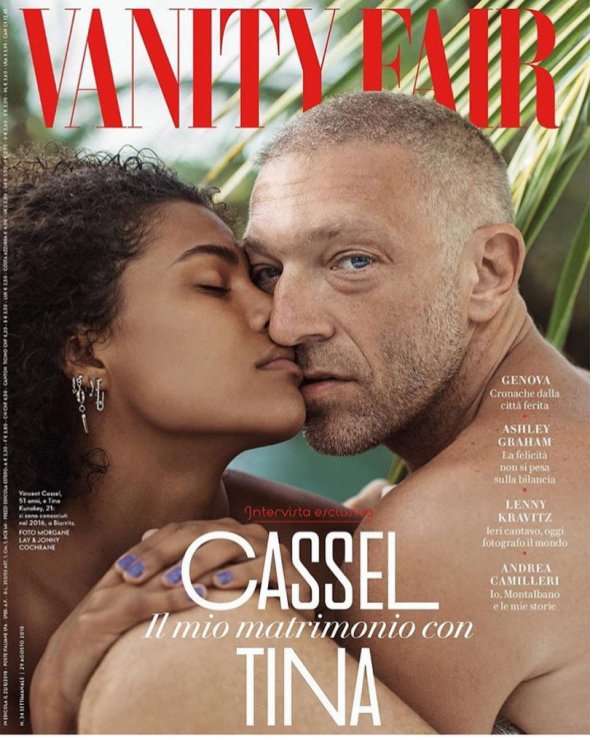 Французький актор 51-річний Венсан Кассель знявся у романтичній фотосесії з моделлю Тіною Кунакі, 21 рік. На знімках закохані позують у купальних костюмах, подекуди Тіна зовсім гола.