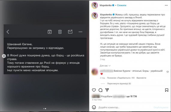 "Живеш собі, працюєш, ведеш перемовини про відкриття українського закладу в Японії. І тут на тобі: японці не хочуть відкривати монозаклад з борщем, бо у них, увага: "поширена думка, що борщ - це російська страва". Зрозуміло, що люди оминатимуть це місце десятою дорогою, бо притомні японці, на щастя, історично є русофобами. І от ми наче на одному боці барикад, а виходить якась дурня. І це чудовий приклад глибини руської пропаганди", - зазначив Клопотенко.