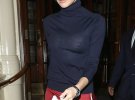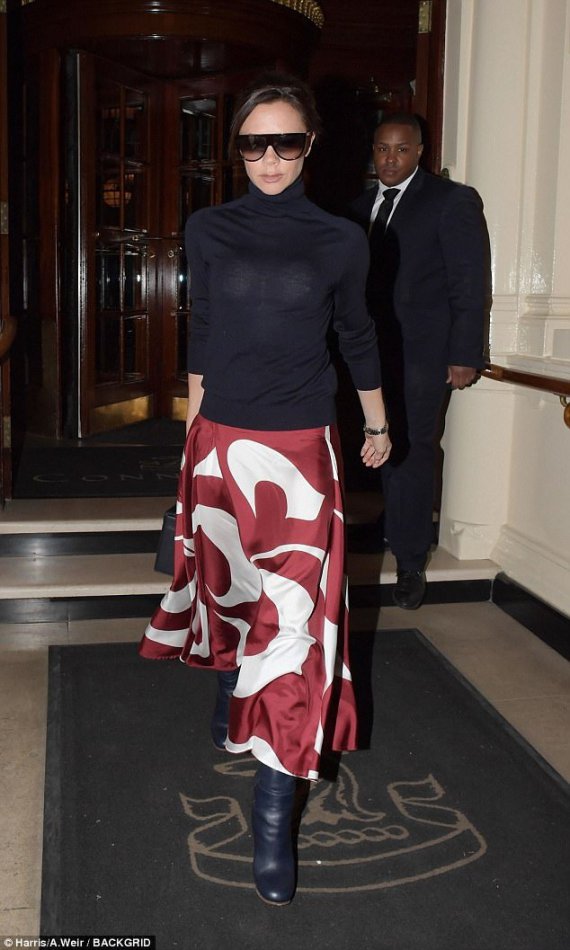 Вікторія виходила з готелю Connaught Hotel у Мейфеір у Лондоні. Вбралась на побачення з чоловіком у спідницю з власної колекції, чоботи та прозору кофту, під якою не було бюстгальтер.