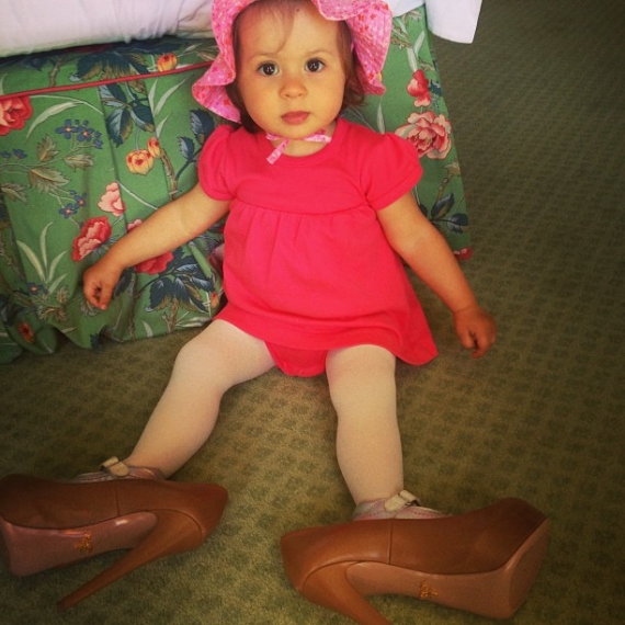 На фото, яке Віка виклала в Інстаграмі, крихітка сидить в яскраво-рожевій сукні і в тон підібраній до неї панамці, а на ногах у Енжі, поверх дитячих туфелек, одягнені мамині туфлі на високій шпильці.