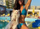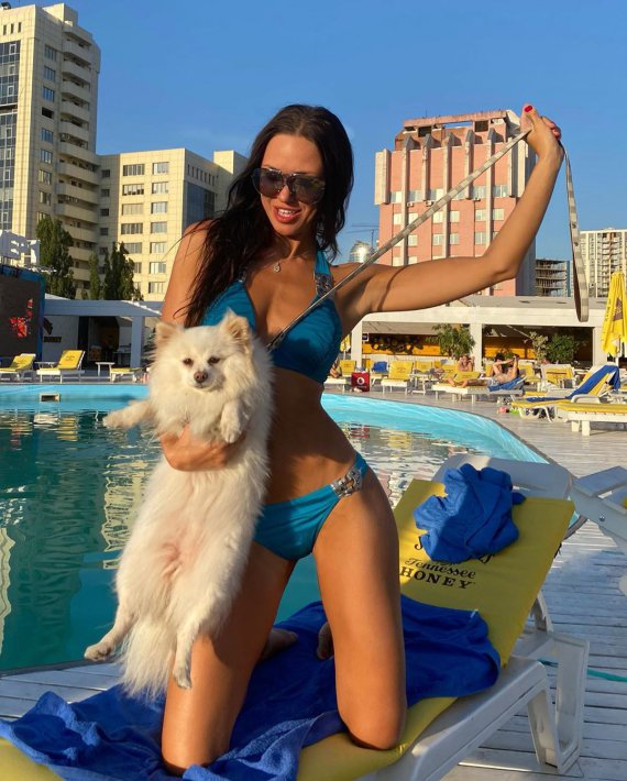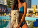На фото Вікторія позує на шезлонгу у блакитному купальнику, тримаючи на руках білого песика Гуччі.