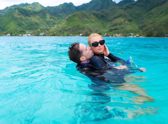 Бізнесвумен із коханим плавали зі скатами в Тихому океані. Гілтон купалася в чорному гідрокостюмі, прикрашеному намистом, від бренду Cynthia Rowley.
