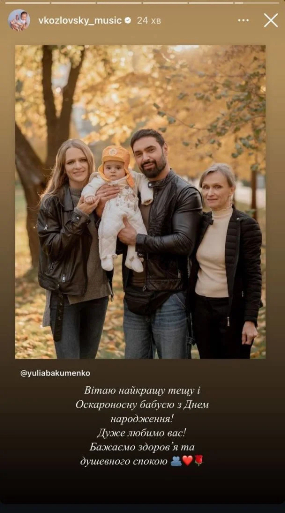 "Вітаю найкращу тещу та Оскароносну бабусю з днем народження. Дуже любимо вас. Бажаємо здоров'я та душевного спокою", - привітав жінку молодий батько.