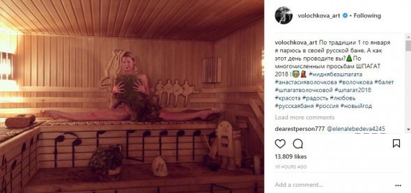 "За традицією 1 січня я парюся в своїй російській лазні. А як цей день проводите ви? На численні прохання шпагат 2018!" - написала Волочкова.