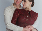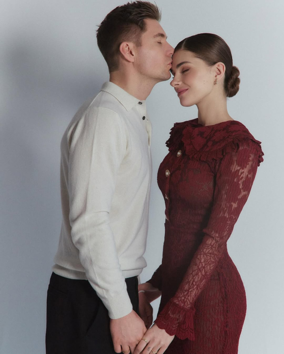 Його кохана показалась у бордовій мереживній сукні. Волосся зібрала в пучок і одягла золоті прикраси.